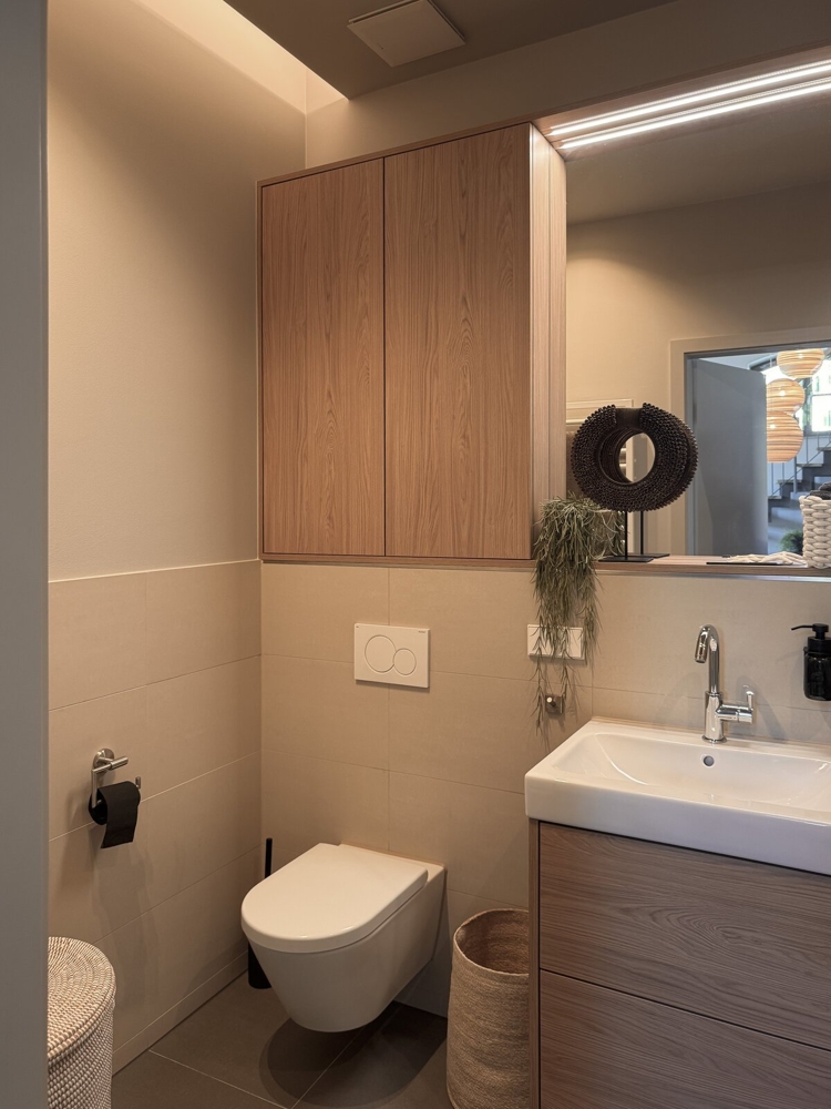 Der Außenbereich besticht durch einen einladenden Pool, der abends dank atmosphärischer Beleuchtung zum Blickfang wird. Verbringen Sie sonnige Stunden auf der großzügigen Südterrasse in Ihrem privaten Garten – ein idealer Rückzugsort für entspannte Momente im Freien. Das Badezimmer überzeugt mit moderner Ausstattung inklusive Badewanne, Dusche und WC sowie einem angrenzenden Hauswirtschaftsraum, der mit Anschlüssen für Waschmaschine, Trockner und Bügelmöglichkeiten ausgestattet ist. Für zusätzlichen Komfort sorgt die umweltfreundliche Erdwärmeheizung mit Fußbodenheizung in allen Räumen.
